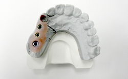 この間接法の作業用石膏模型を使ってインプラントアナログにアバットメント(土台)を装着し、そのアバットメント上でぴったり合うセラミック冠を造ります。