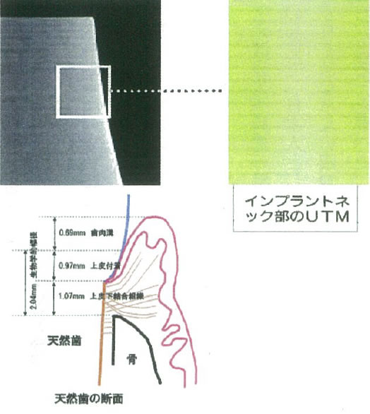 私が現在使用しているインプラントのネック部周囲には、天然歯のように上皮下結合組織の付着を獲得して、インプラントを外界から守るためのUTMという構造があります。