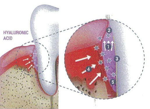 最近ではGBRや軟組織の造成といった再生治療において、ヒアルロン酸を用いた治療が効果的であることが報告されています。この研究は、スイスのベルン大学の歯周病科、Anton Sculean教授のグループによって研究が行われ、EFPの学会(歯周病)でも発表され、歯周病やインプラント周囲炎の治療に対しても効果を発揮すると報告されたのです。